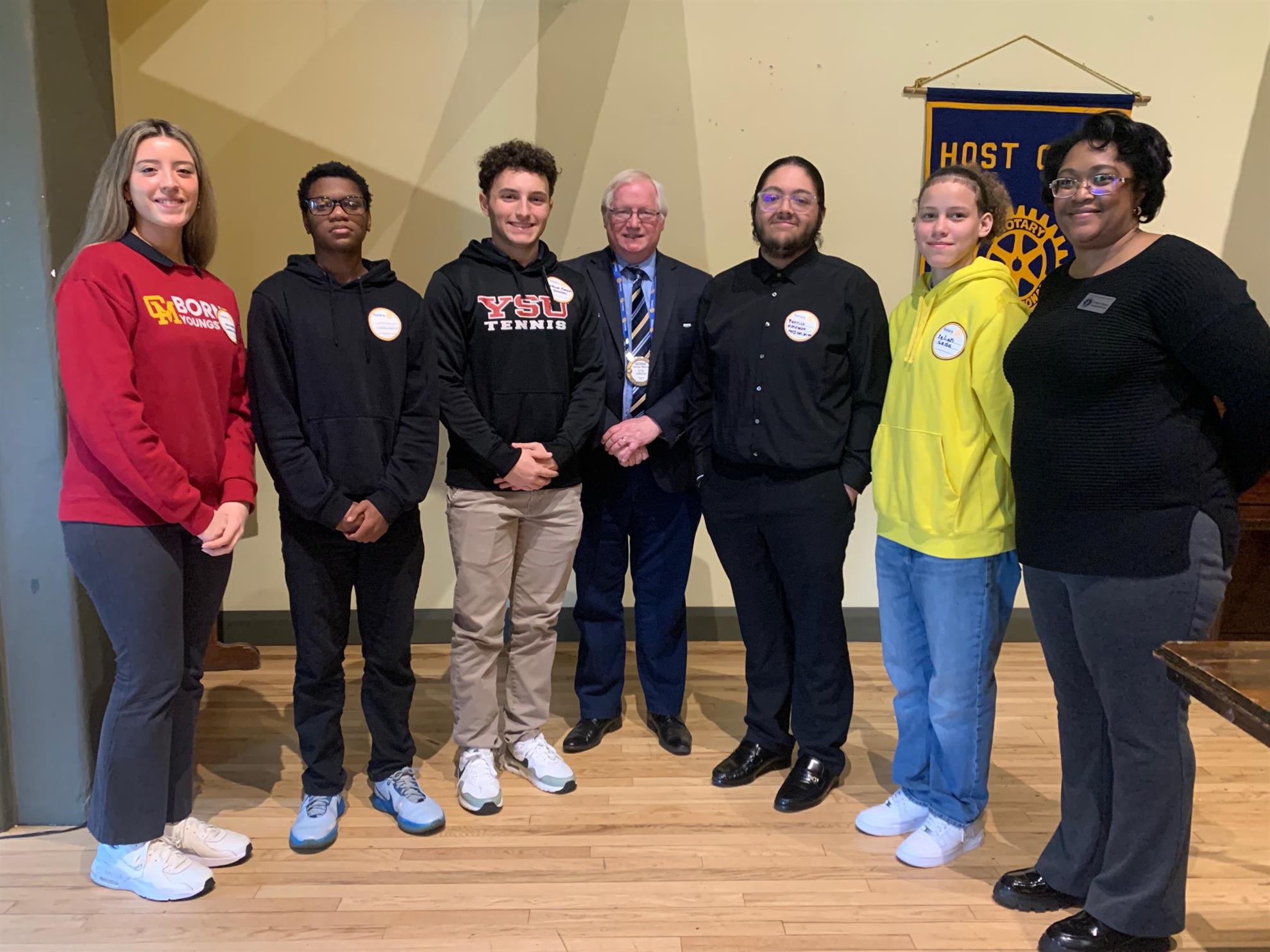 The 2025 recipients are: Lila Wade, Cardinal Mooney; Carl Clark, Chaney; William Morgione, Ursuline; Patrick Montalvo, Valley Christian; YelianSeda, East High School; and JordanRoberts, Rayen Early College. All but Roberts were able to attend the lunch meeting. They were introduced by Rotarians Gregg Rossi and Gerri Jenkins and received gifts from YSU President and Rotarian Bill Johnson.